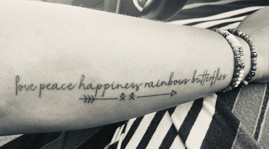 One thing that helps me to do this is to think about those things I’m thankful for, examining my life with gratitude. The focus on what I have rather than what I don’t often helps me to slow everything racing around me. Of course, it doesn’t always work, and if it isn’t helping you either, here’s something you can try. This was something born in my days as a young child as a way to calm my younger sister and clear her mind when she had nightmares or when she was distressed in some other way. I now have this tattooed on my arm and I run my fingers over the words when I need some help to slow down.